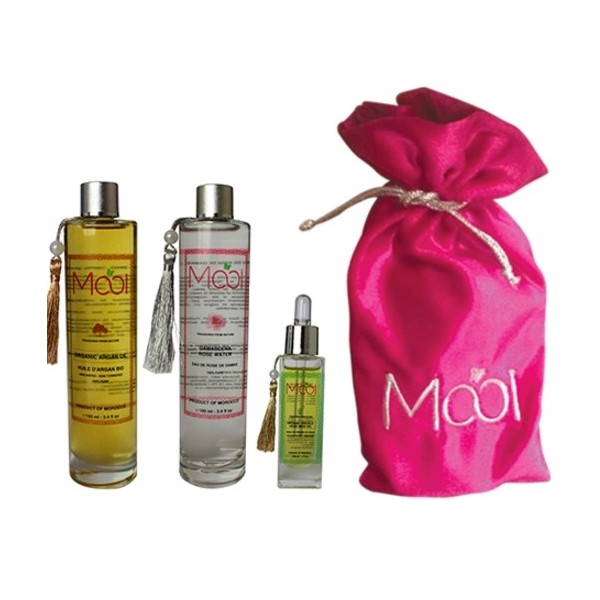 Coffret cadeau 1 contient : 1 huile de graine de figue de barbarie 30ml + 1 Huile d’argan 100ml + 1 Eau de rose de Damas 100ml + 1 coffret en bois Mooï.