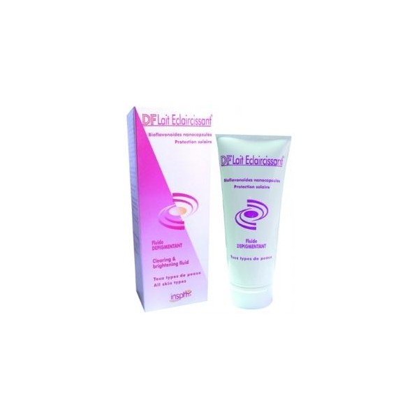 Produit | Le dépigmentation Factor (DF), principal composant actif de DF Lait Eclaircissant se présente sous forme d'un sérum liposomial riche en Bioflavonoïdes, concentrés dans les nanocapsules. Il exerce un puissant effet réducteur sur la synthèse de la mélanine. Son rendement élevé a été scientifiquement testé. Le DF, associé à des vitamines et à des filtres solaires, combat la mélanine responsable des taches de pigmentations. Les filtres solaires protégent la peau contre l'exposition au soleil, tandis que la substance active combat les tâches foncées de pigmentation et réduit l'action des rayons UV sur l'augmentation de la production de la mélanine. DF crème et lait intègrent également le Beurre de KARITE e l'Huile de JOJOBA qui restaurent l'équilibre de l'hydratation de la peau. Grâce à la vitamine E et le beta-carotène, DF Antitache et DF Lait éclaircissant possèdent une action anti-radicalaire positive quotidienne pour combattre les dommages des oxydants (exposition au soleil, pollution, maquillage, fumée, effort) qui accélèrent visiblement le vieillissement de la peau